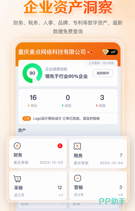 这款能对企业进行管理的应用,可以给大家提供诸多的便利,也是拥有智能服务的,其中的功能包括管理资产,企业有什么样的资产,一目了然的都能让大家看到,除此之外还有管控风险的功能,一旦发现企业有什么风险的话,都会及时的进行提示,帮助每一个企业更好的发展,遇到问题时也能进行实时预警提醒,不管是与品牌有关的,还是与财务工商有关的,都能提前预控风险。