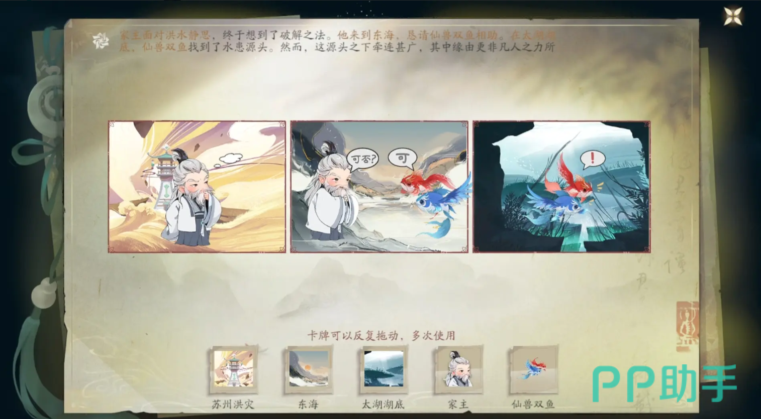 接下来是第二块拼图,元素包括苏州洪灾、东海、太湖湖底、家主和仙兽双鱼。这一块稍微复杂点。你需要先想到苏州洪灾,然后联系东海和太湖湖底。太湖湖底就是封印的地方,家主是解封的关键,仙兽双鱼则是守护者。把它们摆对位置,就能解锁这块拼图。
