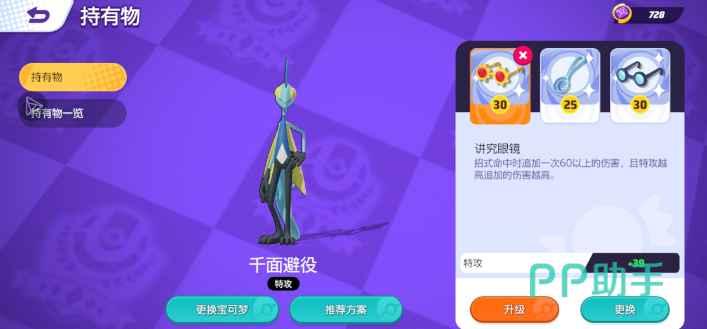 持有物建议大家选讲究眼镜或穿透汤匙,讲究眼镜能在招式命中的时候追加一次60以上的伤害,很适合千面避役这样特攻高的宝可梦,穿透汤匙则是能增加技能穿透率。