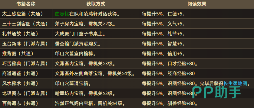 阅读每本书籍都会提供实战经验,阅读进度每提升5%,实战经验加800%。在弟子房的书桌真上选择“反省自己的过失”,那么仁义礼智信在这五种属性都会加1点,并且获得100实战经验,提升2点儒学感悟。