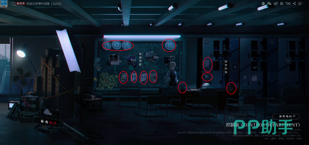 在游戏当中,这32条线索大致分为两个部分,一个是在普通世界,另一个是在意象世界当中,这也是官方做的一项活动,如果找齐32条线索后,可以获得公测的口令码。玩家要先进入到游戏网站当中,在左侧写着认知部的画面当中可以找寻到八条线索,五个电视机上各有五条线索,在右侧的三个仪器上可以找到另三条线索,小编在下方图片当中用红圈圈出来了。