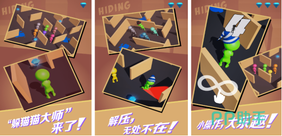 躲猫猫大侠是很经典的一款躲猫猫游戏,在游戏中有两种角色可以让玩家随意把眼,分别就是抓人者以及被抓者。游戏还设立了众多不同的挑战关卡,在每一个关卡当中都会有与众不同的迷宫,需要玩家轻松躲藏。但是玩家在躲藏或者是追击的过程当中也会遇到很多钻石,必须要想办法获取。