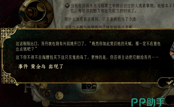 总的来说,这个事件需要我们不断地前往浴场去寻找新事件的产生,另外偷偷告诉大家一个办法,大家可以在摇骰子之前先进行存档,如果发现不是黄金鸟的话,那么可以立即选择读取存档重新刷新。而如果当时币没有四十金币的话,只要在七天内完成交付即可消除金奢靡。