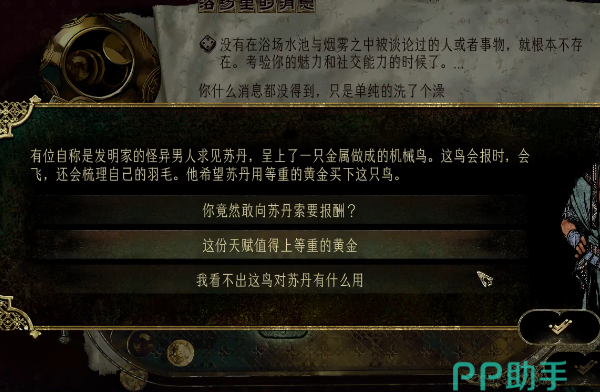 如果这个事件描述的是一名怪异男人呈上了一只金属做的机械鸟,而这只鸟会飞会报时还会梳理羽毛时,这就代表我们遇到这个事件了。这时会出现三个选项,分别是反问,同意付上等重的黄金以及看不出鸟的作用。这里我们选择第二个选项再按下勾键,这个时候系统就会提示我们黄金鸟事件已经出现了,同时金币的数额扣除了四十个。