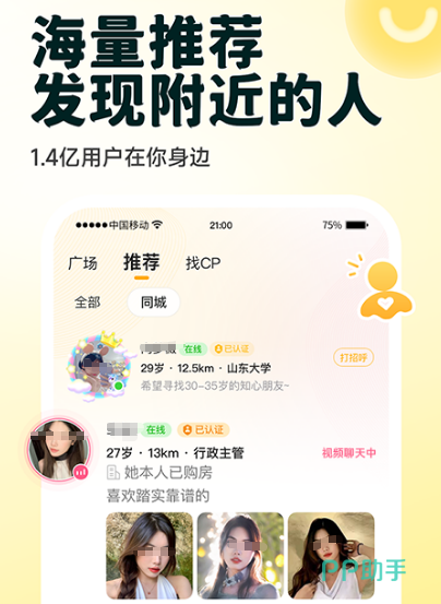 同城交友脱单平台,汇聚全国各地非常优质的单身用户,凭借真诚的态度为用户提供优质服务,很多用户仅仅上线几天就有机会牵手成功。