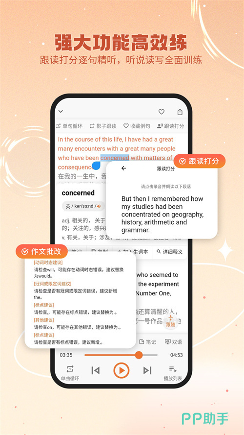 无论是想要加强英语的口语还是语法等,它都是能为大家带来帮助的,同时还有跟读以及打分等功能为大家开放,循环单句也是可以的,旨在让小伙伴们去快速掌握语法。