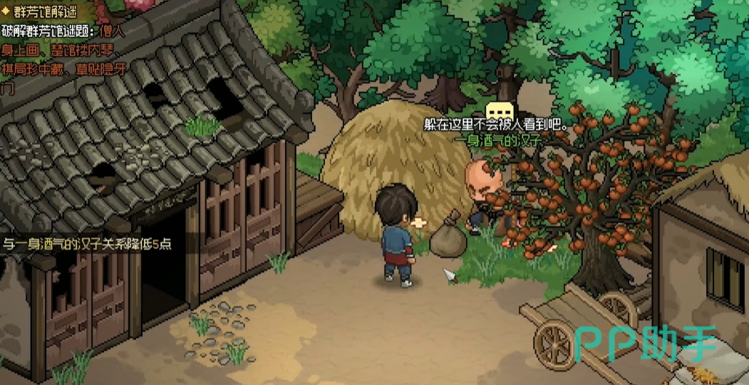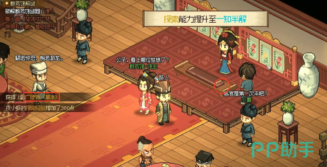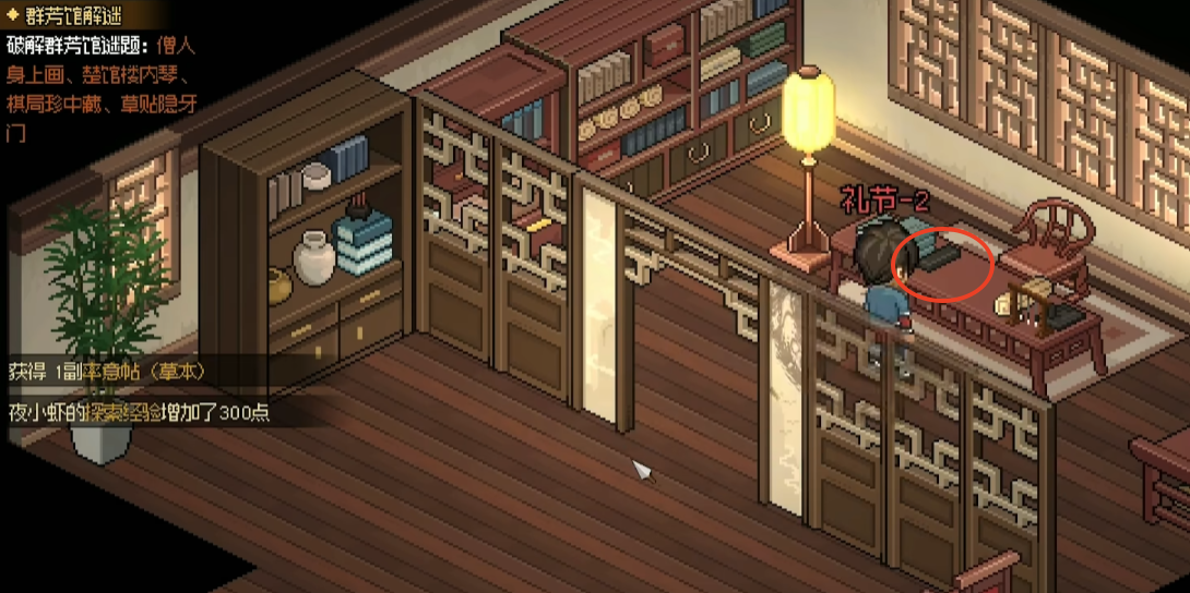 交了10贯押金后后,馆主告诉玩家四个谜题分别是:僧人身上画、楚馆楼内琴、棋局珍中藏、草贴隐牙门。需要玩家找到这四件物品,并将其交给馆主就可以。
