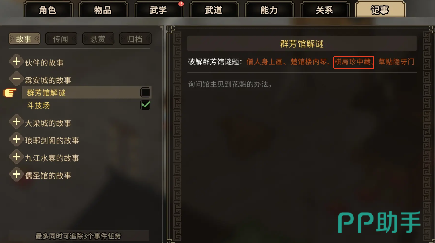 大侠立志传的群芳馆有一位名扬天下的花魁“倾城姑娘”,为了能见上她一面,大家可是费尽了心思。倾城留下了一道谜题,解开的人就会破例与其相见。谜题有多个,“棋局珍中藏”便是其一。那么大侠立志传棋局珍中藏怎么获得呢?这里就给大家介绍下具体方法。