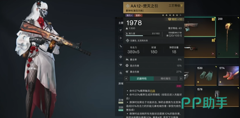 AA12-焚灭之引,加暴击加弱点伤害,命中概率触发灼烧、生成异常微粒拾取进入充能状态,该状态换弹弹药变为龙息弹,换弹消耗所有充能提高炽能伤害。这把枪的输出上限很高,堪比腐蚀,但输出环境较为苛刻,只能贴脸,启动也有点慢,不过养成较为容易,综合来看强度在第一梯队。