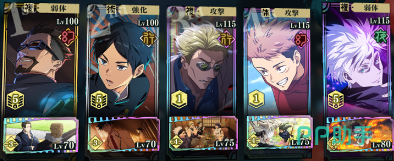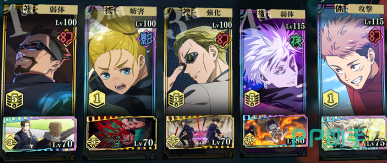 这个游戏里持续多个回合的buff是可以叠加的,因此3辅1C算是比较主流的阵容搭配,根据主C的输出形式,是体术还是术式为主的,然后选择相应属性加成的辅助,再配一些增伤、易伤辅助,将主C的伤害提到最大。那么辅助要怎么选择呢?关键是选增益效果不冲突的,比如说西宫桃(影)+夜蛾正道(幻)+七海建人(幻)+五条悟(夜),援助角色用虎杖悠仁(幻)。