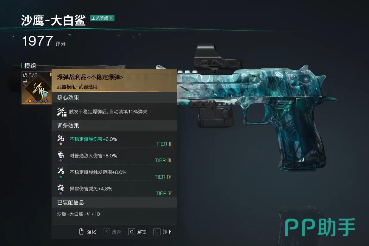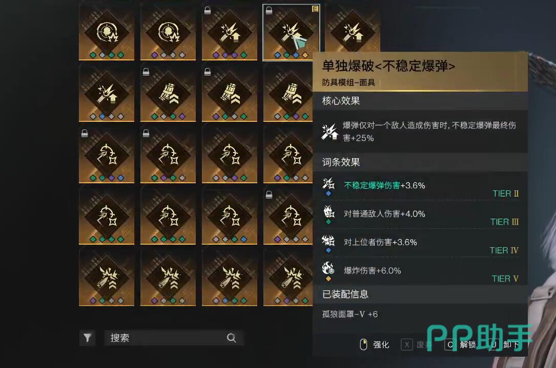 手套大家可以选择暴击强化模组,进一步提升暴击率,增加大白鲨的爆发伤害。裤子推荐玩家使用暴击狂热模组,在暴击后可以追加伤害,提高整体输出。头盔可以选异常大师或幸运牌手,异常大师能增加射速和伤害,幸运牌手则可以增加运气,可能带来一些意外的效果。面具大家可以选择单独爆破模组,这个模组能够提升爆炸性伤害,与大白鲨的不稳定爆弹特性相契合,将伤害最大化。