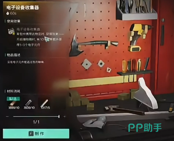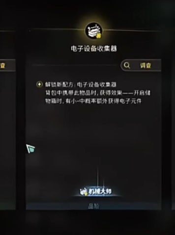 在完成之后,打到等级要求后,接下来大家需要前往制作台,去解锁一个叫做电子设备收集器的佩服,之后需要解锁制作,在解锁之后大家就可以吃到一个buff,这个buff就是在采集的时候有概率获取电子元件。