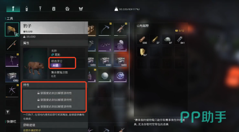 不同的花豹综合评分是不一样,像是这种有三个特性的往往可以给到A级评分,2个特性的B级,1个特性的C级。豹子还可以通过繁殖获得新的豹子,有机会获得更高的特性,但繁育次数也是有限的,没有培养出好的豹子就得不停的去野外刷了。