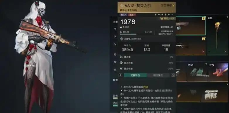 AA12-焚灭之引这把武器在t0武器中是排在第一位的,这把武器可以说是一把强度比较高而且养成又非常容易的武器了,在AA12-焚灭之引中不仅加入了暴击的效果同时还融入了弱化敌人的效果,一旦命中敌人就有可能会触发灼烧效果,武器每一次发的子弹都会生成可以给武器进行充能的异常微粒。