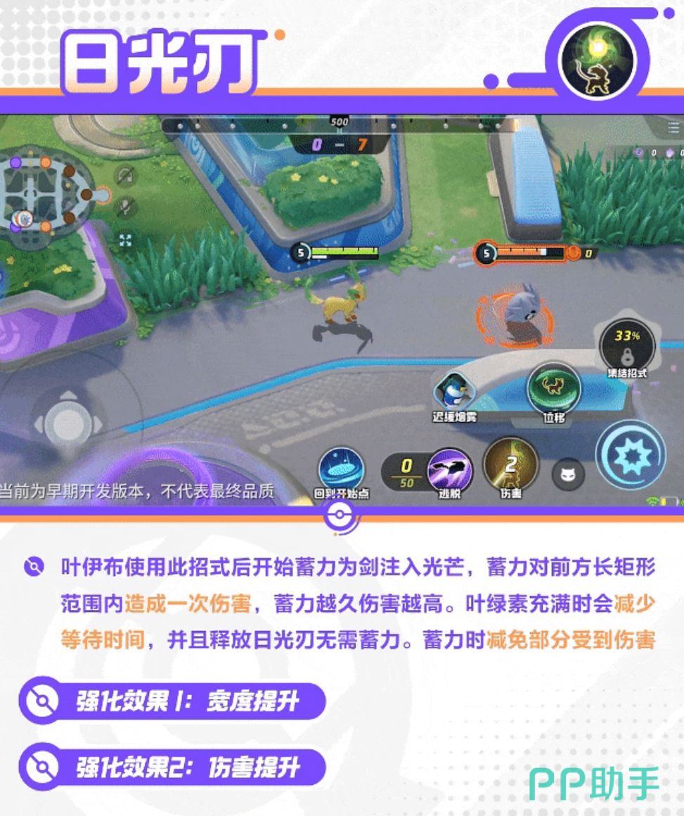 叶伊布的基础技能包括高速星星和电光一闪。高速星星可以朝指定方向发射星星,对命中的目标造成伤害并减速,非常适合用于追击和逃跑。电光一闪则是朝指定方向进行位移,对路径上的敌人造成伤害,适合用于突进和躲避敌方技能。叶伊布还拥有被动技能叶绿素,不在草丛中时,会吸收阳光积累叶绿素能量条,满层时提升移动速度,增强战斗灵活性。在技能选择上。飞叶快刀可以射出五片叶子,对命中的目标造成伤害,如果五片叶子全部命中同一只宝可梦,还会额外获得护盾。这个技能在前期非常强势,适合用于1V1或小规模团战。而日光刃则需要蓄力,蓄力越久伤害越高,满层被动时还能减少冷却时间,非常适合用于消耗和抢中立野怪。