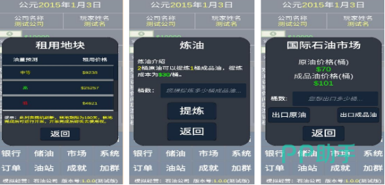 以文字为模式的模拟经营游戏,游戏的玩法非常真实,也有独特模式,比如租地开采石油,玩家需要详细了解每天市场上的石油价格,还要详细了解石油价格变换,根据不同的数据进行开采并售出,只有这样才能够获得更多的利润。另外还要通过策略等多种不同的方式对石油进行提炼,获得更高利润。