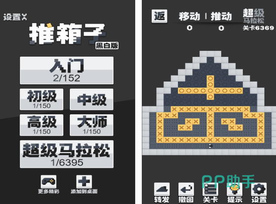 在众多的经典游戏中推箱子也属于比较受欢迎的考验玩家的逻辑推理能力。在这款已经比较经典的版本中主要是以黑白版为主的,因为在最初的时候大家玩的推箱子都属于这种风格的,只是如今的很多新版推箱子都融入了其他的元素,在颜色上更加亮眼了。此游戏中拥有5个难度级别,还有6000多个关卡内容。