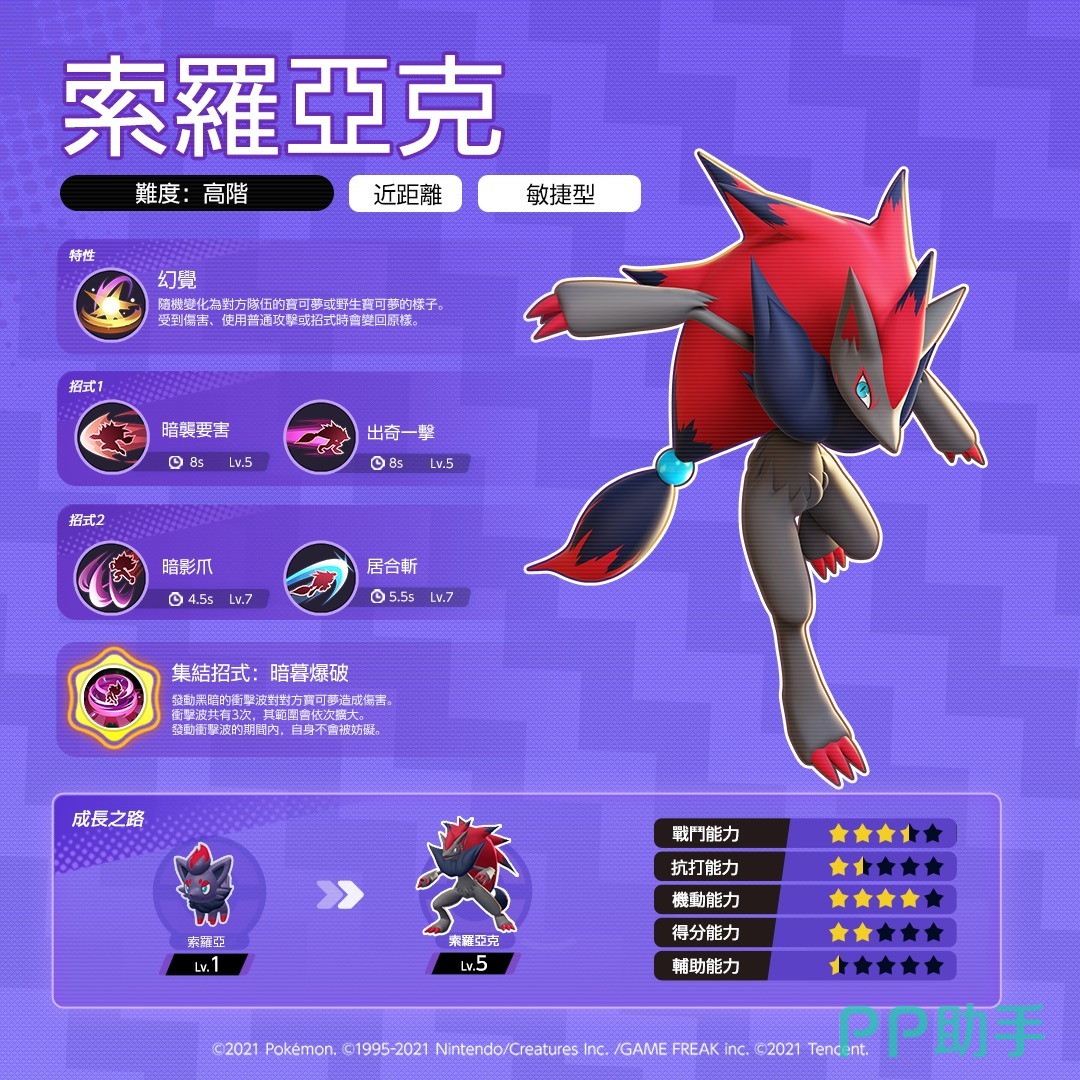 索罗亚克是一位需要精准操作和战术意识的角色。推荐指数4星,更适合承受们进行操作、收割。需充分发挥其敏捷和伤害优势,选择合适的分路和配招,也就是熟练掌握其技能机制和定位,才能在宝可梦大集结中发挥最大效力。