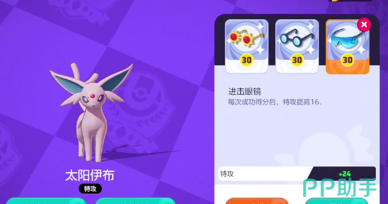 讲究眼镜在一定程度上可以提升太阳伊布的爆发能力,由于追击输出的策略依赖太阳伊布的精神冲击,在精神冲击释放之后,太阳伊布必须要进行下一步的技能输出释放,而在此期间,可以触发讲究眼镜的效果,造成基础攻击倍率至少为200%的输出数值。