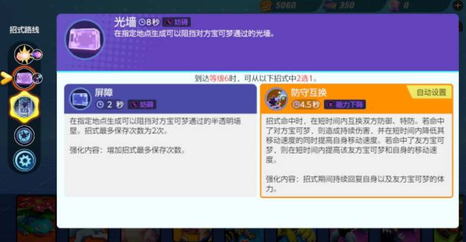 在技能选择方面,魔墙人偶的初始技能包括“击掌奇袭”和“光墙”。其中“击掌奇袭”能够对敌人造成击退效果,并附带一定的伤害;“光墙”则能够在指定区域生成一道屏障,阻挡敌人的进攻。击掌奇袭的升级选择上,如果你更倾向于远程攻击和控制,那么“念力”是一个不错的选择。它能够对直线上的敌人造成击退效果,并附带额外的伤害。而如果你更看重对敌人的持续伤害和特防降低效果,那么“精神强念”则更适合你。它能够对范围内的敌人造成持续伤害,并降低其特防,使队友的输出更加有效。