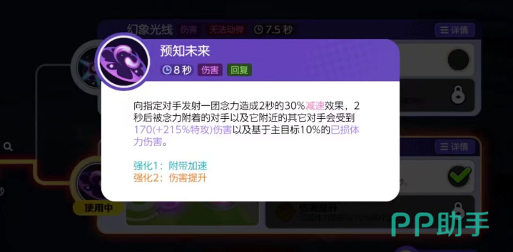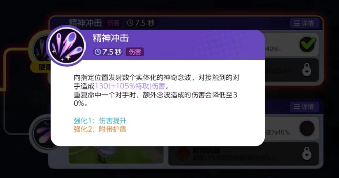 在技能选择上,太阳伊布的一技能在进化前为高速星星,可以向指定方向快速释放三颗星星,类似于精神冲击。进化后,可以选择升级为辅助力量或精神冲击。辅助力量,能够为太阳伊布提供回复能力,而精神的冲击则能够在团战中造成大量伤害。二技能在进化前为叫声,是一个锁定技能,可以对敌方造成单体伤害。进化后,可以选择升级为幻象光线或预知未来,幻象光线能够削减敌方特防,而预知未来则能够提升伤害。这里没有固定的推荐,大家看战局自由选择即可,小编只建议大家一技能最好第一时间升级精神冲击,能在中期小团战中拿到不小的优势。