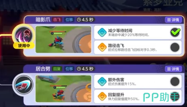 除了要搭配这种技能效果之外,还需要根据角色的技能来搭配使用方法,索罗亚克的技能是劈开和暗影爪,劈开技能能够向前位移并造成一段伤害,非常适合在追击敌人的时候或者逃跑的时候使用,升级之后的技能是居合劈和暗袭要害,居合劈在位移之后恢复一定的生命值增加宝可梦的持续战斗能力,暗袭要害可以进行特殊攻击,命中6次后可以造成范围性的伤害。