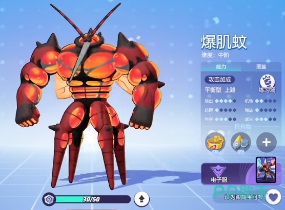 在技能搭配上,推荐采用猛扑+吸血的组合,猛扑技能允许爆肌蚊向前飞扑一段距离,对敌方宝可梦造成伤害并降低其20%的攻击力,而吸血技能则能让爆肌蚊快速接近目标,控制住一位敌方宝可梦,对其造成多次伤害的同时回复等量的生命值,值得注意的是,根据当前肌肉计量槽的状态有0-3格,该技能造成的伤害次数及回血量也会相应变化。