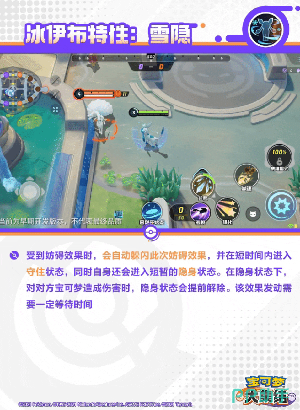 除了主动技能外,冰伊布的被动技能为雪隐,这一技能为冰伊布提供了一定的自保能力,使其在面对敌方攻击时更加灵活。在团战中,玩家可以合理利用对方的妨碍效果反而去增强冰伊布的生存能力。