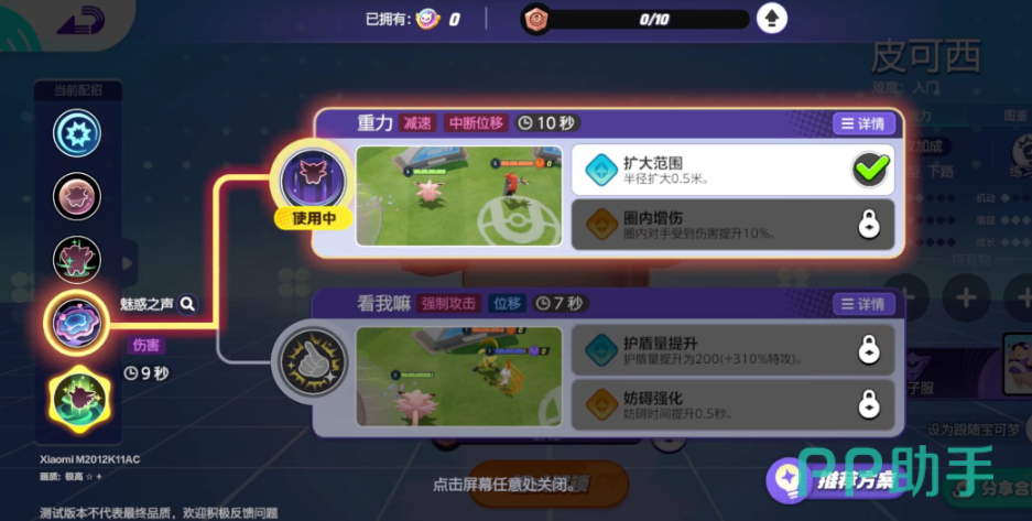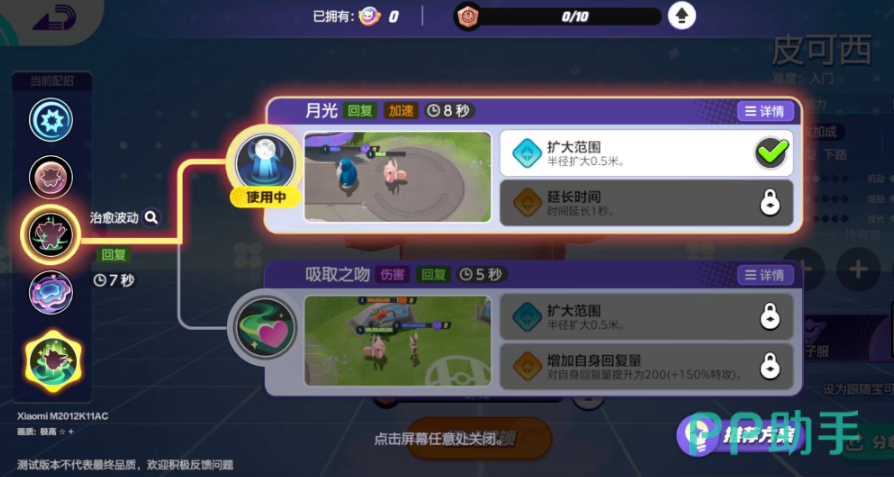 在游戏中,皮可西是一名辅助型宝可梦,擅长群体治疗和提供战场支援。它的被动技能十分给力,“魔法防守”可以在为友方宝可梦进行治疗时,根据治疗量额外获得护盾,这使得皮可西在团战中能够更好地保护自己和队友。在技能选择上,皮可西的“治愈波动”是一个关键技能,它可以选择升级为“月光”,为自己和周围的友方宝可梦持续恢复生命值,并提高移动速度。