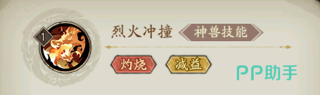 在解锁了麒麟神兽以后,我们将自动获得麒麟自带的技能,猛火冲撞,这个技能是一个火属性的技能,把麒麟放到战场以后,麒麟身体就会燃起熊熊的大火,在火焰的包裹下,麒麟将会向敌人发起猛烈的冲击,每一次冲击都会在战场中留下无法扑灭的火焰,若是敌人被麒麟的冲击撞到的话,火焰将会直接在敌人的身上燃烧,对手不仅将会体验到灼烧的痛感,同时,熊熊燃烧的火焰还将会给敌人带来减益的效果,让敌人痛苦不已。
