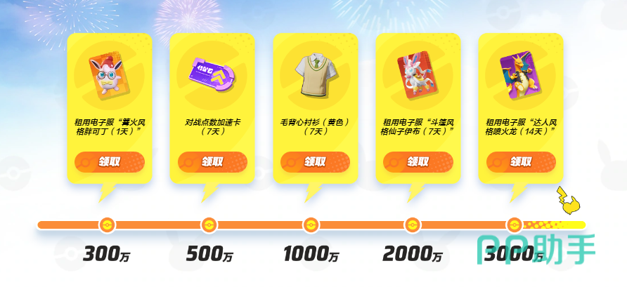 首先是3000万预约人次奖励,包含胖可丁、仙子伊布、喷火龙的电子服,对战点数加速卡,训练师毛背心衬衫,这些只要是提前预约了就可以在进入游戏后从邮箱中获取。