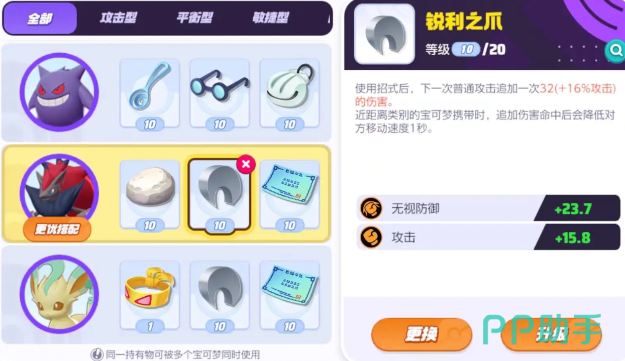 为了进一步的增加我们的输出,这时候最好继续佩戴讲究眼镜。这一件持有物的作用很特殊,当你的招式命中敌人时可以增加伤害。搭配上锐利之爪的额外增伤,甚至可以争取一套技能就带走对方。这时候副词条尽量选择攻击,进一步提升伤害。