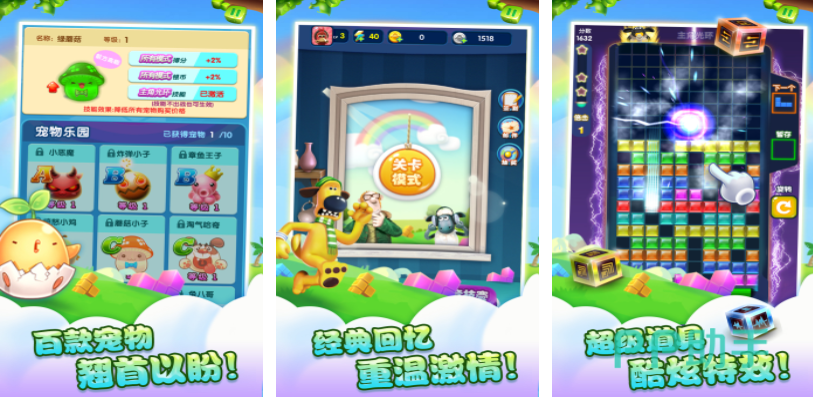 天天方块消除也是款品质精良且上手容易的消除类小游戏,本作算是俄罗斯方块的变种拥有超级有趣的游戏模式,宠物系统的加入让游戏具备了一定的养成机制,经典好玩的消除方块设定老少皆宜让玩家放松了心情,酷炫特效的加入让游戏的画面效果更加刺激,全触屏的操作机制也大大增加了这款神作的代入感。