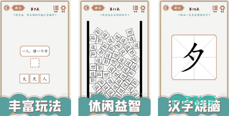 汉字之间可以通过加减笔画或者偏旁部首不断进行变化,汉字多变化就是根据这种特性设定的游戏,在游戏里面有比较烧脑的加减一笔组成全新的汉字,同时也有相对来说比较休闲益智的汉字找不同或者是拼字玩法,玩家需要在这些考验里面通过偏旁部首的组合,获得正确的汉字,同时要在大量相像的汉字中找出最不同的一个,对于玩家来说是乐趣性很强的汉字类游戏。