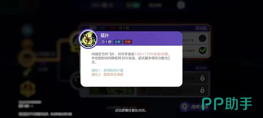 猛扑会向前飞扑一段距离,对目标路径上的宝可梦造成伤害。强化分支的时候,小伙伴们可以选择强化二,提高攻速,有利于单挑和打团,肌肉能量可以快速的累积,还能降低敌人的攻击力。