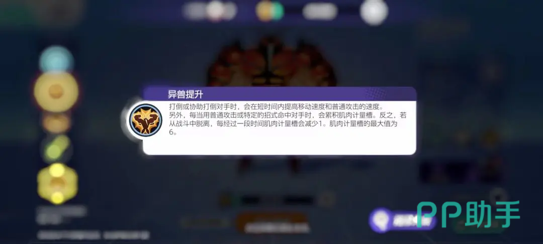 要注意它的异兽提升,可以在打倒对手的时候提高自己短暂的移动速度以及攻击速度,此外,当自己的普攻或者是技能命中对手的时候,还会累积自己的肌肉能量,从战斗脱离之后,肌肉能量会随着时间减少。所以小伙伴们在战斗过程中要注意不要离开敌人太远的距离,保持自己的能量值状态不要降低。
