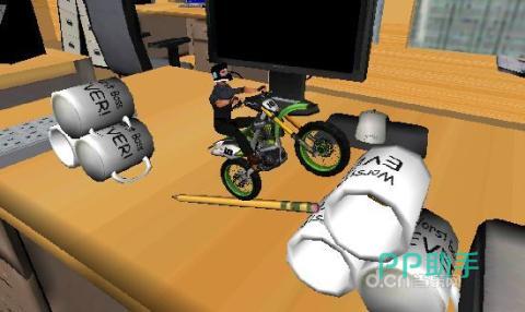 游戏中的场景设置堪称一绝,它会将玩家缩小后置于办公场景之中。想象一下,玩家骑着摩托车,在这个微缩的办公世界里穿梭,即将面临的重重障碍都是办公室里常见的物品。办公桌上的文件堆如同小山丘,椅子腿像是林立的树木,而那长长的胶带仿佛是危险的陷阱。这种独特的场景与越野玩法相结合,让玩家体验到一种前所未有的越野乐趣,既充满新奇感又极具挑战性,使游戏在众多同类作品中脱颖而出。