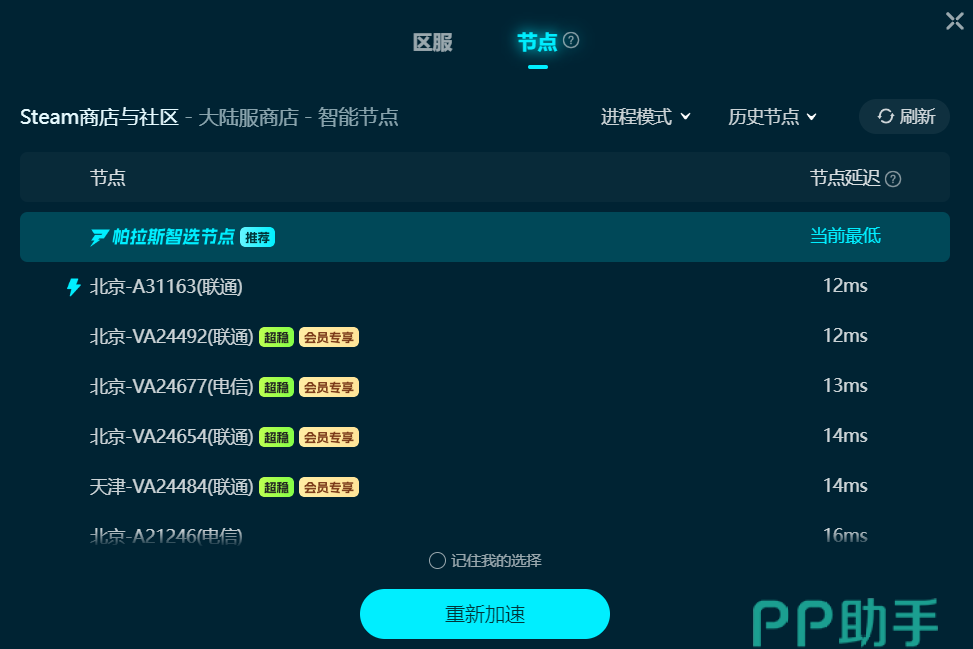首先,直接在首页搜索框中输入steam,点击一键加速即可进入专区页面,在“进程模式”下拉菜单中,根据实际地理位置或希望下载游戏所在的服务器位置,选择一个最合适的下载节点,这样的调整有助于提升游戏的下载速度。