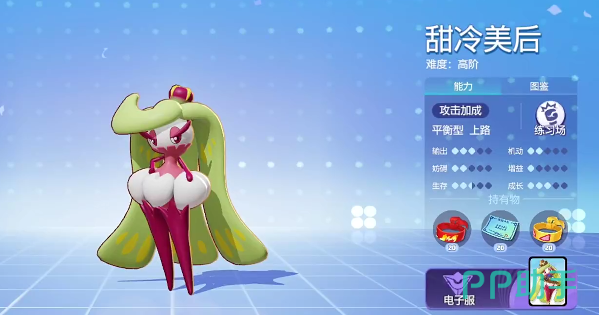 它的二技能有吸取之吻和冥想可以选,前者是朝对手发射飞吻,飞吻会在自身和敌人之间回弹,每次自身接触都能回复自身体力,敌人接触会造成伤害,而后者使用后会在短时间内提高自身特攻、特防和移速,它的大招会先进入守住状态,然后攻击范围内的敌人并补充自身体力。