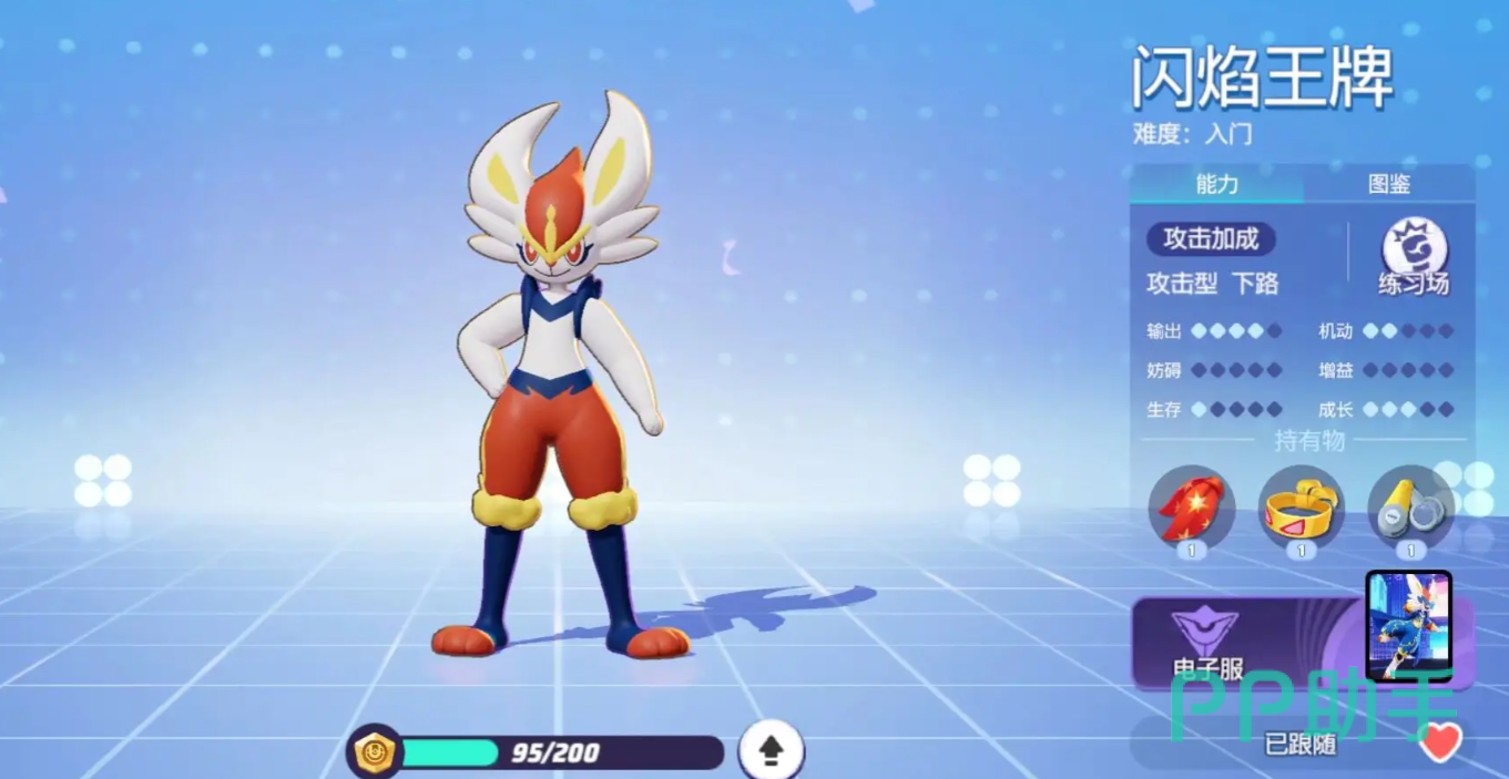 闪焰王牌属于攻击型拥有很高的体能,在爆发力方面更是能在所有宝可梦中处于顶级水平,他的特性能在体力一半以下时,提高自身20%暴击率,且提高10%攻速,每一次使用的时候下一次普攻会变化,强化普攻,普攻和招式击中敌人都能在其身上留下火种,火种叠加到一定层数会引爆造成额外伤害;