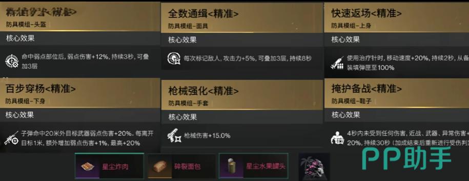 各部分其他装备模组选择分别如下:头盔可以用精准打击,效果是弱点伤害的加成;面具最好是全数通缉,每次标记敌人都能增加5%攻击力可以叠加3层持续15秒;上身选择快速返场增加移动速度且增速备弹装填;下身用百步穿杨也是对弱点打击的一个加成;手套选择枪械强化是直接增加枪械伤害;鞋子则用掩护备战提升异常伤害幅度。