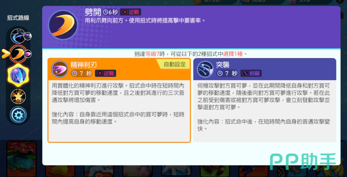 对于二技能“劈开”,玩家可以选择升级为“精神利刃”或“突袭”。“精神利刃”可以向前方劈出实体化的心之利刃,对对方宝可梦造成伤害,并在2秒内对其造成减速效果,同时标记被命中的对方宝可梦,接下来自身对该对方宝可梦造成额外伤害。这一技能非常适合用于拉扯和追击敌方宝可梦。而“突袭”则可以在伺机攻击对方宝可梦时降低自身移动速度,在2秒内对对方宝可梦造成减速效果,一旦对方宝可梦企图发动攻击或自身受到直接伤害,则向前突进造成伤害,并带来一段控制效果,再或者直接打出伤害。所以搭配上小编优先推荐“追打”+“突袭”的追杀组合。或者“精神利刃”+“暗袭要害”的高伤害组合。