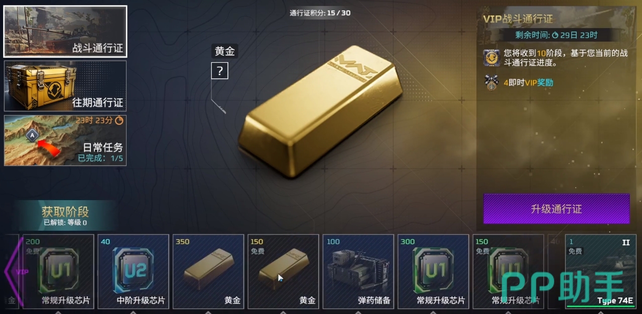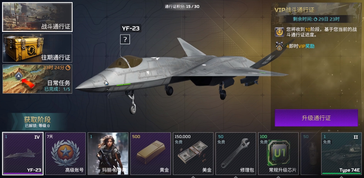 通行证会随着等级提升而给予玩家们相应的奖励,这些奖励包括指定的坦克或飞机,一定数额的金条,以及蓝色和绿色升级材料,每一阶段的通行证奖励都是可见的,玩家们可随时查看各阶段等级可拿到的奖励。此外,通行证里的坦克和飞机都有着不错的实用性,强度也较为不错,属于玩家们必拿的奖励之一。