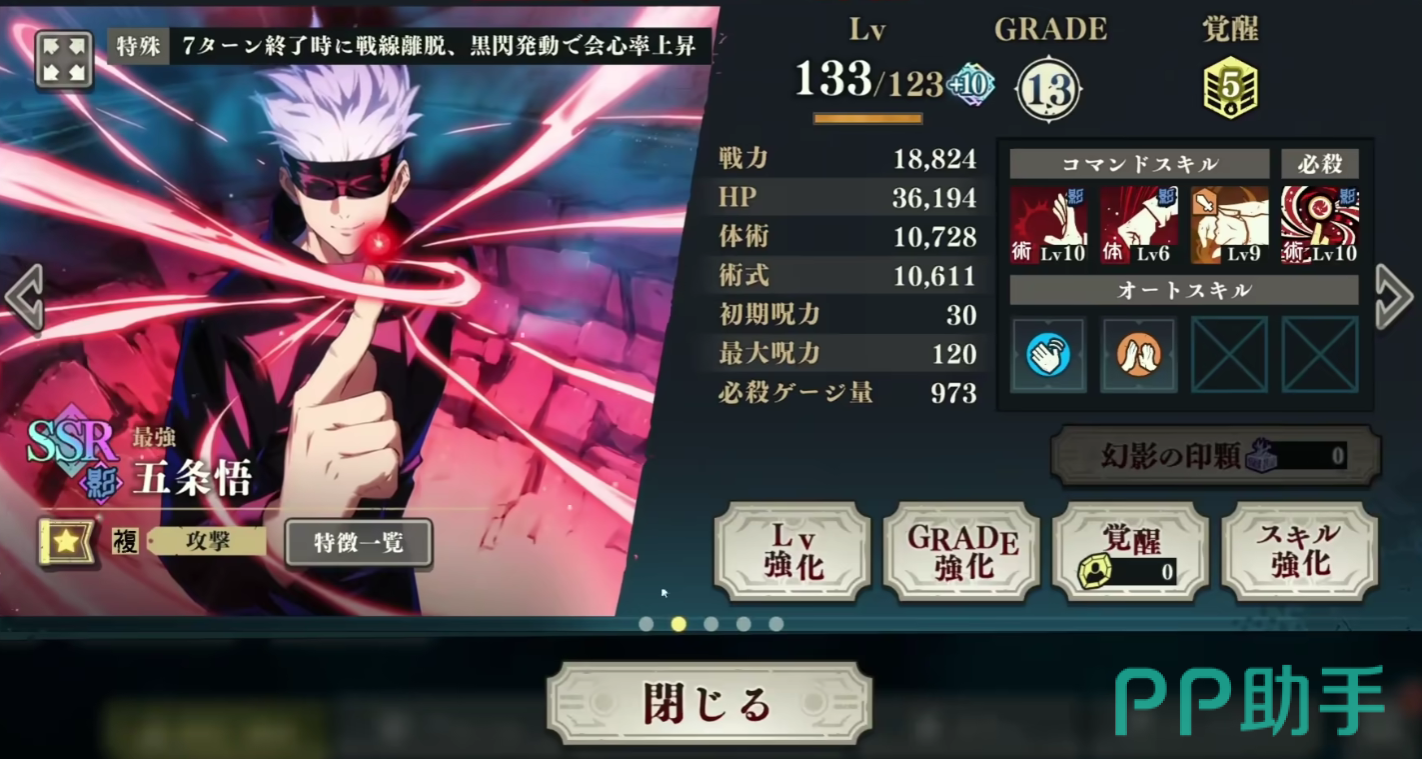 《咒术回战》是一款根据同名漫画进行改编的回合制策略战斗手游,玩家在游戏当中可以通过抽卡的方式,来获取各类不同属性的咒术师,游戏一比一还原了原版剧情内容中出现的所有角色,其中包含有夏油杰、五条悟、家入硝子、乙骨忧太等等,并且每个角色都按照了他们的剧情发展流程展开了属性分类,例如游戏将五条悟分为了两种模式,第一个模式是高专属性的五条悟,此时的五条悟强度不如教师属性的五条悟,并且他的评级是SR。