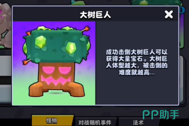 在爆裂小队游戏中怪兽的种类非常多样,每种怪兽都有独特的技能和特点,在战斗时的时候需要抓住他们的弱点才能够快速的击败,大树巨人出现在随机事件中,拥有非常高的血量和强大的攻击能力,技能有尖刺环绕、尖刺冲击、巨型尖刺、树根冲击,尖刺环绕能够在地面周围生成一圈尖刺,顶起目标,尖刺冲击的技能可以发射一个冲击波造成伤害和击退的效果,巨型尖刺从地下钻出一个巨型的尖刺,能对玩家造成伤害和击退的效果,树根冲击性的效果可以在地面上蔓延出树根,会将路径上的目标进行击退,技能非常的强大,且想要靠近也是非常难的,在战斗的时候,玩家团队需要有格雷格的存在,格雷格是砍树专家能够对大树巨人造成巨大的伤害。