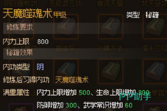 第二个要介绍的是天魔噬魂术。想要获得天魔噬魂术,需要走燕军线并完成相应的任务。这一神奇内功可以显著提升500点内力和300点生命,同时增加300点防御和60点武学基础。它的特别之处在于,通过攻击敌人,将20%造成的伤害转换为自身生命,并吸收目标5%的内力,为自身补充能量。