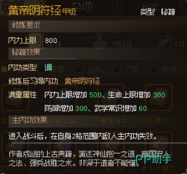 黄帝阴符经是一个具有战略意义的特殊内功,可以让范围内敌人的主内功失效。因此若遇到难以击败的强敌,不妨试试这套技能。尽管在其他场景中作用有限,但关键时刻它可能就是你的制胜法宝。