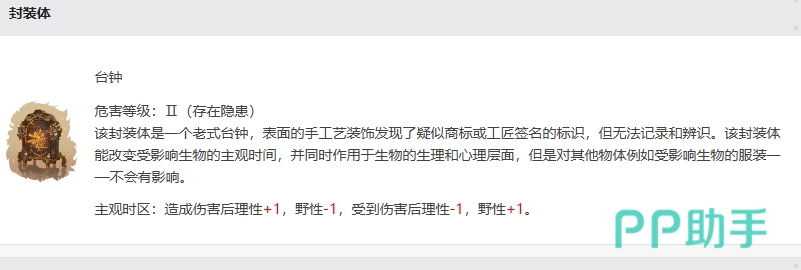 这台钟的表面装饰着疑似商标或工匠签名的标识,但无法记录和辨识,该封装体的危害等级存在隐患,它能改变受影响生物的主观时间感,并同时作用于生物的生理和心理层面,但对其他物体例如受影响生物的服装则不会有任何影响,这个封装体带来的效果是主观时区的变化,当造成伤害后理性+1,野性-1,而受到伤害后理性-1,野性+1。