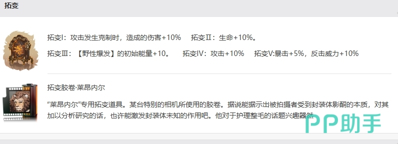 而且通过生成屏障和回复生命值,队友之间能够持续作战,而拓变效果也为他提供了多种增强能力,拓变I在攻击发生克制时,造成的伤害增加10%,这个效果使得角色在面对特定类型的敌人时能够造成更高的伤害,拓变Ⅱ会让莱昂内尔生命值增加10%,这个效果直接提高了角色的生存能力,拓变Ⅲ带来野性爆发的初始能量增加10的效果,这个效果使得角色在使用野性爆发技能时能够更快地积累能量。