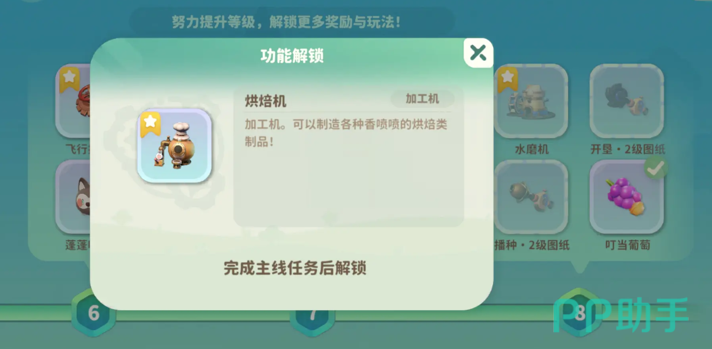 大家在游戏中可以查看进阶手册,当你的世界等级达到7级之后。便可自动解锁烘焙机功能,使用后可以制作各种香喷喷的烘焙类食品。然后点击领取,即可放置在工作站中使用。不过会占用部分家园位置,大家要腾挪出足够宽敞的土地才行。